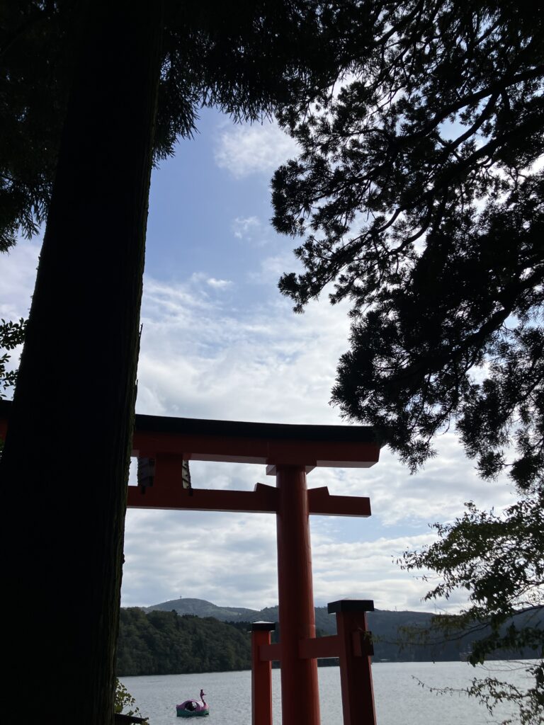 芦ノ湖と赤い鳥居が写る撮影スポットは